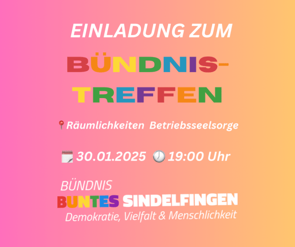 🫵 Du bist herzlich eingeladen. Am Donnerstag, den 30.01 treffen wir uns um 🕖 19 Uhr zum Bündnistreffen. 🙌 Komm vorbei in die Evangelische Betriebsseelsorge in die 📍Vaihiger Straße 24.