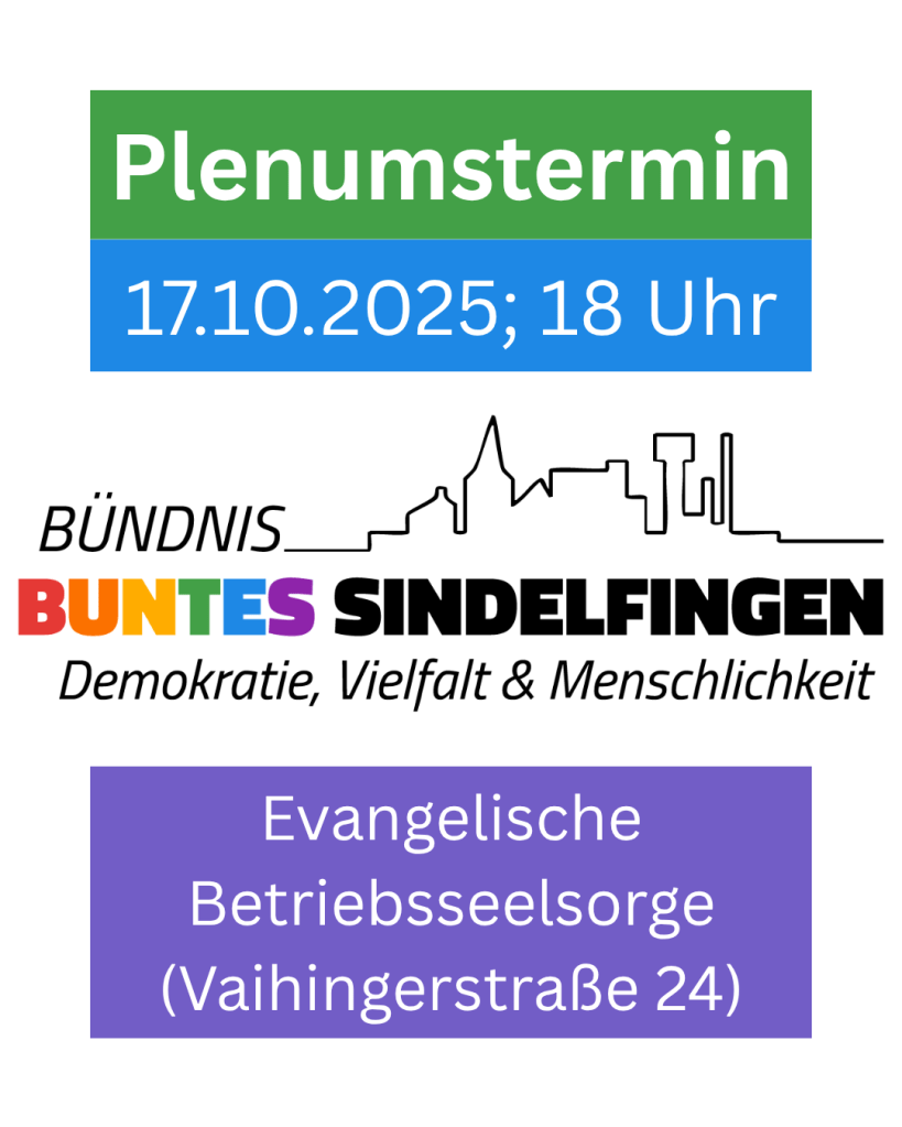 Hiermit laden wir herzlich zum nächsten Plenumstermin am 17.10.2025 um 18 Uhr in der enangelischen Betriebsseelsorge, Vaihingerstraße 24, 71063 Sindelfingen, ein.